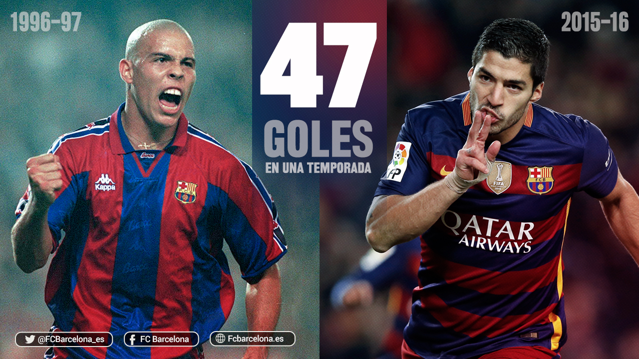 -Luis Suárez superó la cifra de goles de Ronaldo en una misma temporada. El brasileño marcó 47, y ahora el uruguayo ya suma 49. Se convierte, de este modo, en el único jugador que ha superado esta cifra dejando de lado Messi, que tiene como techo los 73 goles en una misma temporada del curso 2011/12.