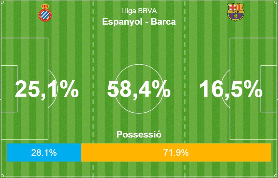 Los hombres de Luis Enrique dominaron el partido en todo momento, con una posesión del 71,9%. Una cuarta parte del juego, además, se desarrolló en los alrededores del área del Espanyol. En la primera parte la posesión azulgrana rondó el 80%.